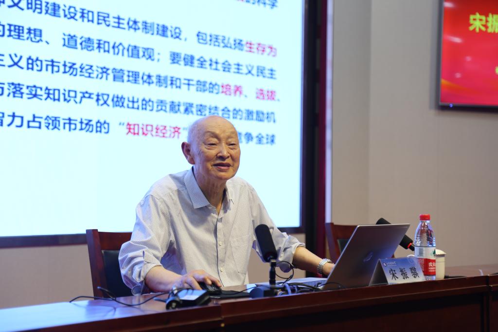 宋振骐院士以“以史为鉴、开创未来”开场,重温习近平总书记在纪念马克思诞辰200周年大会上提出的重要讲话,将中国共产党带领中国革命、建设和改革的各个时期取得的重大成就与学校发展的光辉岁月相结合,以科学家和教育家的独特眼光,从创新驱动、全民共举、强化领导、法治保障四个方面讲解新时代的鲜明特征,带领与会师生感受波澜壮阔的科技强国之路。虽已是87岁高龄的耄耋之年,宋院士却精神矍铄,语言风格轻松诙谐、激情洋溢。
