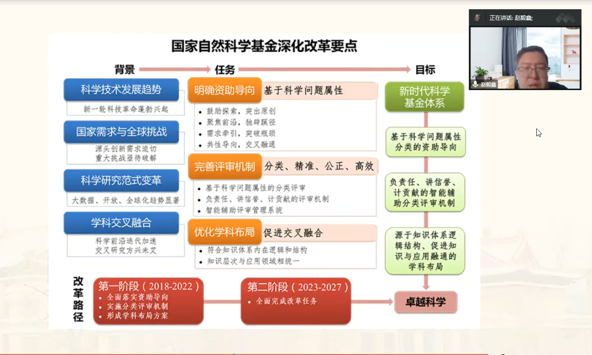 赵毅鑫从一般性原则、基金政策解读及2022年主要变化、不同类型基金申请评审等三个方面,详细介绍了国家自然科学基金的战略定位、审核改革要点、资助格局、研究项目/人才项目系列/环境条件项目系列、评审流程等基础事项,对2023年度国家自然科学基金青年基金、面上项目、重点基金等不同类型项目的重点填报事项进行了详细讲解和解读。在互动环节中,多位教师提出了基金申请过程中的疑问,赵毅鑫逐一进行了耐心、细致地讲解。