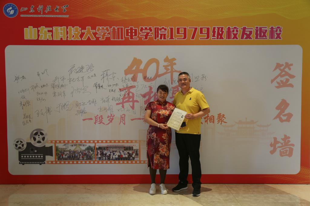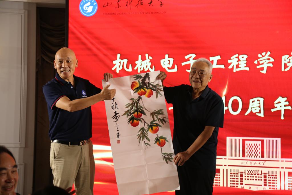 9月18日下午,校友们陆续报道,在签名墙前签字、合影留念,手里拿着的入学档案是对青春的眷恋与怀念。当日晚间,机电学院举行校友聚会晚宴,83岁的退休老教师宋奎武接过校友送上的“寿桃图”,并为校友们送上真挚的祝福。校友们踊跃发言,一同回忆过往、见证当下、展望未来,彼此祝福明天越来越好,共同祝愿山东科技大学越办越好。