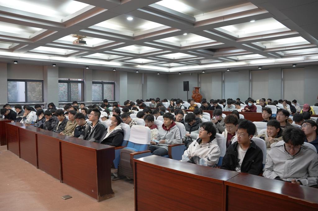 在热烈的掌声中,邱吉喆以轻松幽默的口吻开启分享。他通过复盘实验室日常的思维碰撞、备赛期间的技术攻坚、项目展示时的精彩答辩,从创新实践者的独特视角,生动勾勒出科创赛事的全貌。真实鲜活的成长故事与赛事影像资料相互印证,将抽象的创新实践转化为可感可知的奋斗图景,成功点燃了在场学子探索创新的热情。