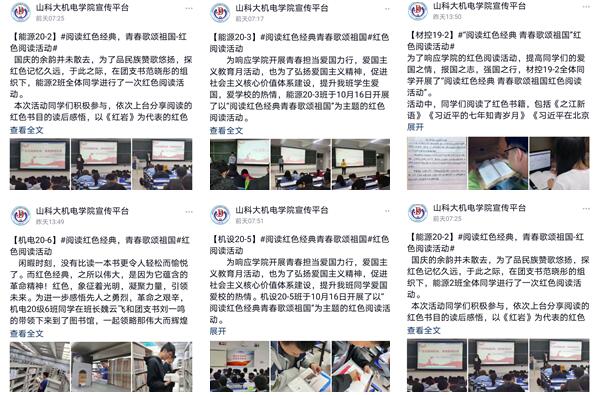 阅读红色经典书籍活动中,各班级分别通过团日活动或主题班会等形式扎实开展,其中,机电20-6班的同学们在班长和团支书的带领下来到图书馆,借阅红色读物,营造出浓厚的读书氛围;能源20-3班组织分享《长征》《可爱的中国》《党旗颂》等书籍,围绕习近平新时代中国特色社会主义思想畅谈读书感悟;智造20-3班组织同学阅读分享《毛泽东选集》《共产党宣言》等书,感受马克思主义与中国革命和建设实践相结合的深厚力量;机电20-5班阅读《强国之路》等书,深刻感受在中国共产党领导下伟大的发展历程……活动过程中,同学们深刻理解、阅读,积极推荐、分享,畅谈读书感悟,形成阅读笔记,充分将爱国之情和报国情怀紧密结合。