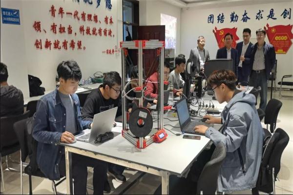 与会嘉宾与备战“高教杯”全国大学生先进成图技术与产品信息建模创新大赛的机电队员进行交流,队员们现场演示比赛的3D打印环节,与会领导寄语他们增强信心,努力提高,争取在国赛中取得优异成绩。