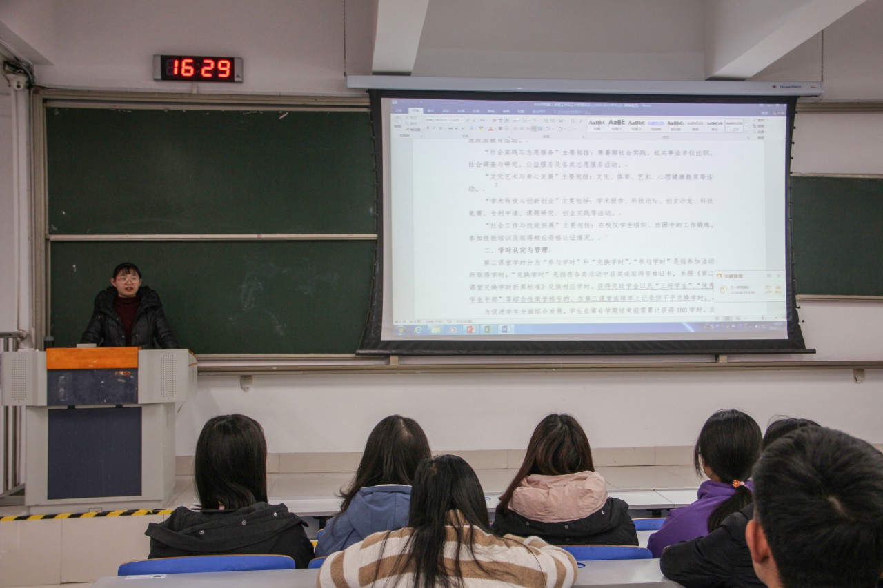 培训会上,祝月盈、宋阔围绕第二课堂活动的意义和作用,第二课堂成绩单的课程设置、学时认定与管理、如何发起、学院第二课堂工作站相关工作内容,PU口袋校园的使用方法向同学们介绍第二课堂相关内容,重点讲解了各类课程的学时数要求、第二学期兑换学时应注意的方面。老师们表示,第二课堂是发展特长、塑造个性的重要方式,要注重在第二课堂活动中锻炼能力、提高素质,充分发挥第一课堂和第二课堂的补充配合作用。