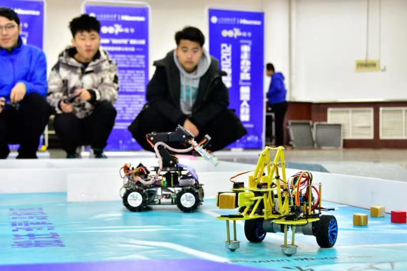 比赛采用机器人循迹越障取物与学校历史发展节点相结合的方式,参赛选手控制机器人的行进路线并越过障碍物,从“初创基业”(启动区)出发,依次经过“风雨兼程”(丛林区)、“改革发展”(桥梁区)、“开拓前进”(迷宫区),象征我校在发展过程中历经多次重大历史事件的考验与艰难曲折的洗礼,合舟共济、奋发有为,各项工作取得成就,最终到达终点“喜迎70华诞”,选手操纵机器人将“机关钥匙”搬运至终点进行堆叠,表达山科学子勤学笃行、以优异成绩回报母校的拳拳之心,最终堆叠误差小、用时少的选手胜出。