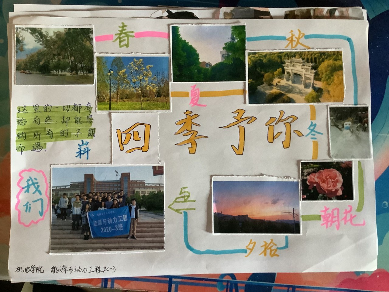 参赛作品围绕风景、人物、生活等多个方面展开,同学们利用照片拼接出自己的内心世界,充分表达出心中所爱。机电20-3班的作品利用日出、日落、夜晚的天空景色展现出光阴变化,同学们向着太阳的身影体现了乐观向上的内心世界;能源20-3班的作品则是科大校园的四季交替和班级合影交融在一起,体现了他们朝气蓬勃、团结向上的精神机设20-2班的作品中巨轮和高铁交相辉映,科技工作者的专心研究与军人在南湖游船前面对党旗的庄严宣誓场景,表达出青年学子肩负重任,立志报效祖国的决心。经过评选,能源20-3班获得一等奖,机电20-3班、机设20-1班获得二等奖,机电20-5班、机设20-2班、智造20-3班获得三等奖。