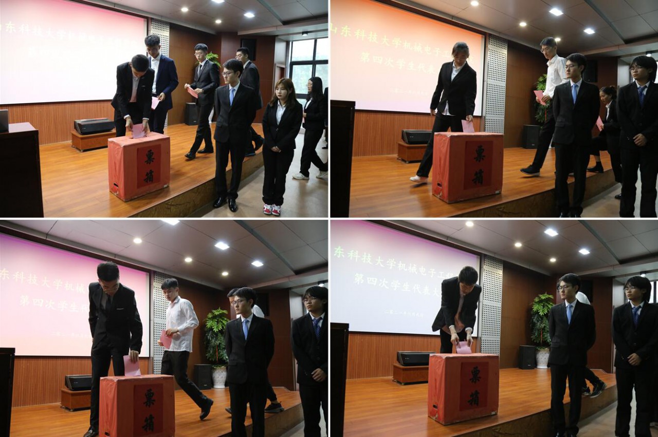下午6时,机械电子工程学院第四次学生代表大会举行第二次全体会议。大会总监票人公布计票结果。大会选举产生了机械电子工程学院新一届学生会和机械电子工程学院第四次学代会学生代表,通过了《关于<山东科技大学机电学院学生会工作报告>的决议》,通过了《关于<山东科技大学机电学院学生会章程(修正案)>的决议》。