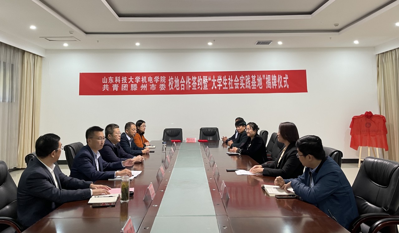 点击:为推动山东科技大学机械电子工程学院与滕州团市委深入开展青年人才交流合作,10月22日,机电学院、共青团滕州市委校地合作签约暨“大学生社会实践基地”揭牌仪式在滕州国防教育基地举行。滕州市委常委、组织部部长李义,滕州市副市长秦升学,枣庄团市委副调研员秦军,滕州市退役军人事务局局长俞涛,滕州团市委书记赵素贤,校团委副书记马鹤,机电学院党委副书记、副院长陈猛,机电学院团委书记樊玉华出席活动。 李义部长代表滕州市委、市政府对基地的成立表示热烈的祝贺,对出席揭牌仪式的各位专家、各位来宾表示诚挚的欢迎和衷心的感谢,并就滕州基本概况以及近年来所取得的创新创业成绩进行了介绍。李义部长表示,此次山东科技大学机械电子工程学院在滕州建立大学生社会实践基地,不仅为广大青年学子提供了广阔实践平台,更有力推进了山东科技大学人才资源优势和滕州市产业集聚优势融合发展。