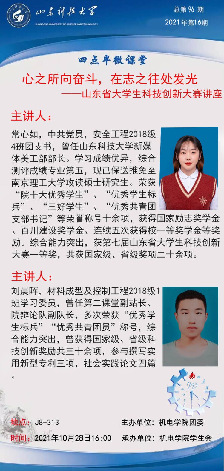 点击:为了激发学生对科技创新的兴趣,提升参赛能力,10月28日下午,机电学院在j8-313举办了“心之所向奋斗,在志之往处发光”山东省大学生科技创新大赛讲座暨第95期四点半微课堂,安全学院安全18-4班团支书常心如、机电学院材料18-1班学习委员刘晨辉担任主讲人。