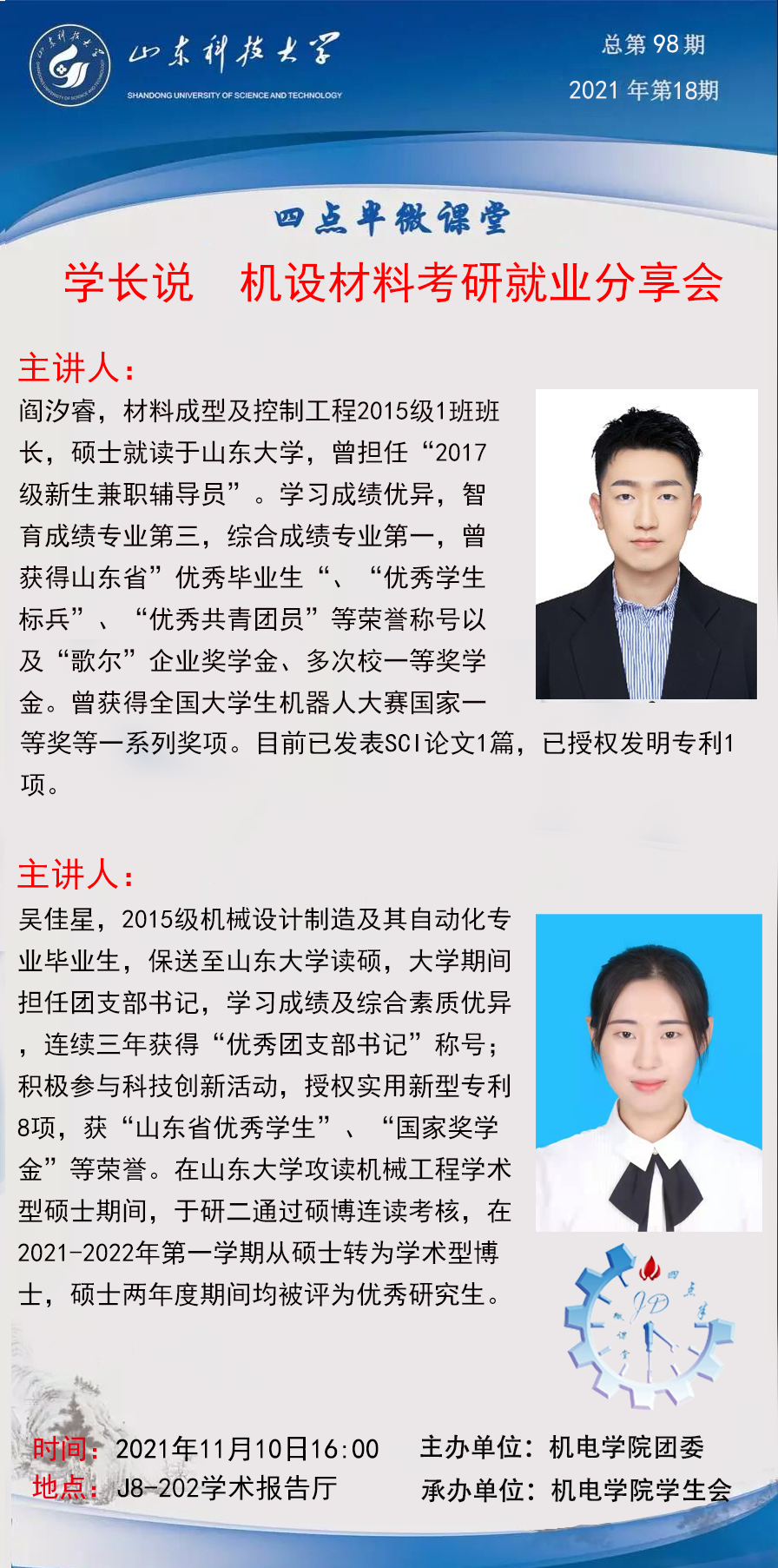 点击:为了使同学们了解考研与就业的实际情况,帮助同学们更好地明确目标、确定方向,11月10日下午,机电学院在学院报告厅举行考研就业经验线上分享会,材料成型及控制工程、机械设计制造及其自动化专业2019届毕业生阎汐睿、吴佳星担任主讲人。
