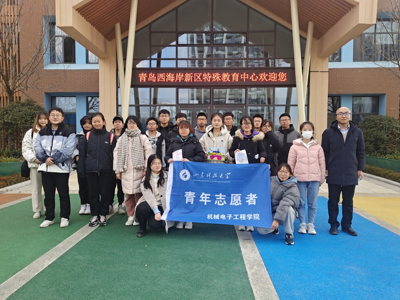 11月30日下午,志愿者乘坐大巴到达青岛西海岸新区特殊教育中心。特教中心李晴老师带领志愿者参观了学校的新教学楼,向志愿者介绍有关特殊教育的知识以及学生们在体育、文艺等方面的优秀表现,丰富了志愿者对特殊教育的认识。
