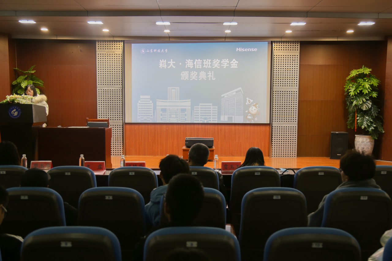 1210日下午,机电学院在学院报告厅举办“嵙大·海信班”2021年度奖学金颁奖典礼暨卓越工程师进校园专题讲座。海信视像科技股份有限公司人力资源部副总经理梁艳华,工艺部副总经理覃露,人力资源部招聘经理贾玉玉,机电学院党委副书记、副院长陈猛出席大会,海信班全体学生参加。颁奖典礼由机电学院学工办主任、“嵙大·海信班”校内班主任樊玉华主持。