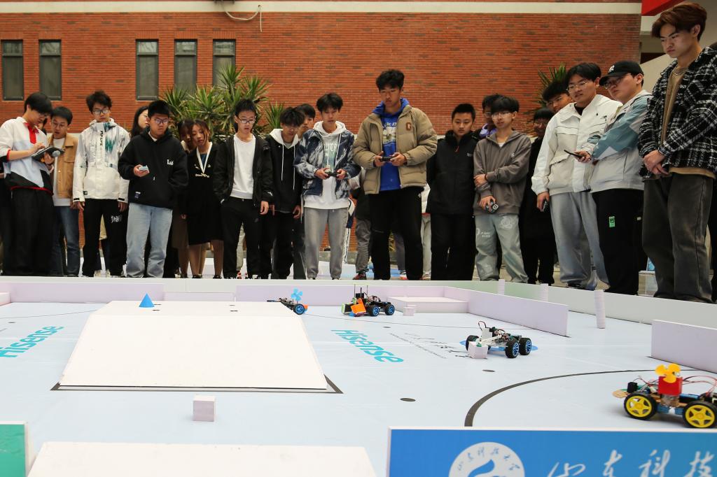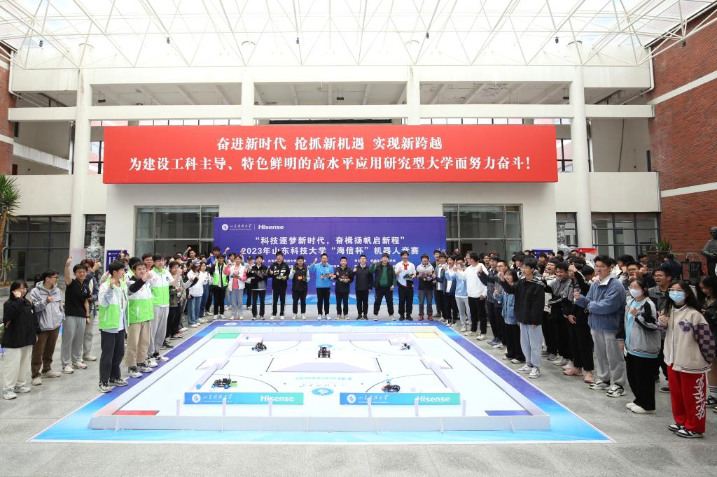 点击:“快速搬运”“进攻防守”“分秒必争”……精密的设计,巧妙的组合,默契的配合,这是2023年山东科技大学“海信杯”机器人大赛决赛现场。