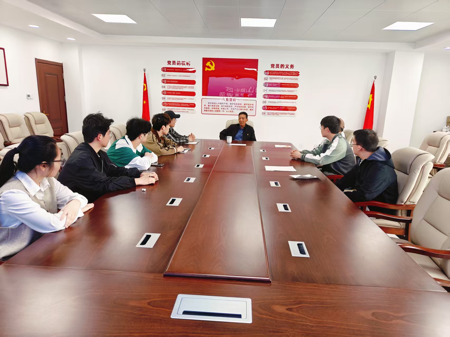 五四青年节来临之际,为深入学习五四精神,汲取先辈奋斗经验,近日,机电学院与辛安街道金榜山路社区组织“传承五四精神,赓续红色血脉”青年座谈会。邀请社区老党员王玉国为青年学子讲述奋斗历史,诠释五四精神。